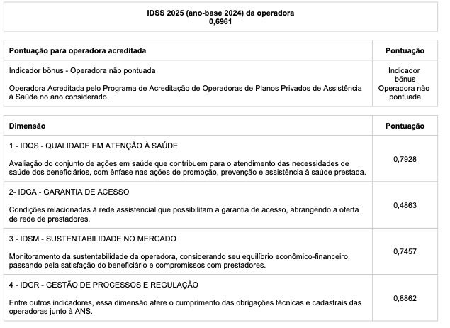 O Índice de Desempenho da Saúde Suplementar (IDSS) faz parte do Programa de Qualificação de Operadoras (PQO) que é uma iniciativa desenvolvida pela Agência Nacional de Saúde Suplementar (ANS) para avaliação anual do desempenho das operadoras de planos de saúde.